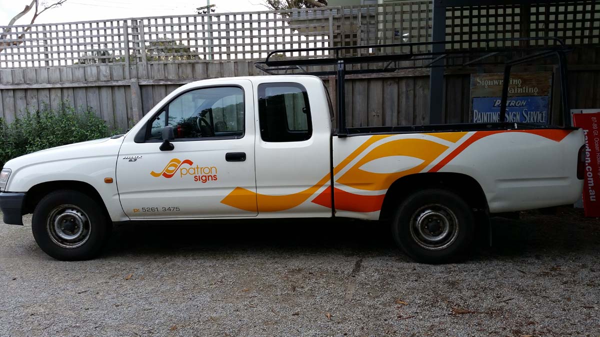 Vehicle signage is a brilliant way to promote your business, sporting group or organisation as your message is freely transported around the region. At Patron Signs we can provide comprehensive vehicle signage whether it is a vinyl vehicle wrap or vinyl lettering.